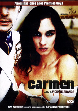 Yo creo que realmente merece la nota de cero, ya que a parte de lo que ya comenté la película tiene algunos elementos más que la hacen insoportable. Por ejemplo, durante los 15 primeros minutos la película esta narrada por el escritor de Carmen, un total desacierto ya que los primeros 10 minutos de una peli deben enganchar al espectador y Aranda lo único que hace es aburrir. Los pesonajes estan poco trabajados y no son en absoluto fieles a la obra original. Leonardo Sbaraglia es un soso que no transmite nada, es un cara de palo cuando conoce a Carmen y lo sigue siendo el resto de la peli, cuando en realidad su personaje es jovial y alegre hasta que enloquece por ella. Paz Vega se pasa toda la película abriendose de piernas y escupiendo, ya sea naranjas, uvas, manzanas, o simplemente escupiendo, y su personaje es muy frío y calculador, no tiene sentimientos, y la Carmen original era una mujer pasional que realmente estaba enamorada del personaje de Sbaraglia, pero no podía evitar hacerle daño. Eso sin contar con los numeros errores populares que campan a sus anchas por la peli, como el que ya dije de que en esa época había mucha analfabetización, lo cual impediría que Carmen supiese leer y escribir; o que a pesar de que Paz Vega sea una mujer guapisima, lo cierto es que en esa época no se hubieso comido una rosa, ya que se llevaban las mujeres jamonas de las que agarrarse. Un hombre de esa época si se encuentra a una mujer tan seca y delgaducha como Carmen no le hubiera echo ni caso.