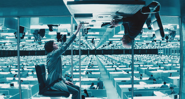 La producción es una autentica pasada, los decorados son de impresión y la dificultad de realizar semejantes imágenes se palpan. El director maneja con ligereza la situación, haciendo totalmente creíble la interacción de los habitantes del mundo superior, un mundo totalmente enriquecido, con los del inferior, totalmente pobres pero no por ello infelices. Las escenas en el lugar de trabajo llamado ‘Intermundo’, que conecta ambos mundos y dónde es el único lugar de trabajo donde los habitantes de ambos mundos se pueden comunicar de una manera más cercana, son totalmente realistas y bien dirigidas, haciendo que unos trabajen en el techo y otros en el suelo (según como se mire será al revés). Ah, y también en una acogedora cafetería llamada ‘Entre dos mundos’ situada en el mundo inferior, pero que es tan alta que los del mundo superior construyeron unas cabinas tele transportadoras para crear otro bar en el techo de este, resultando de lo más llamativo y hermoso.