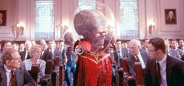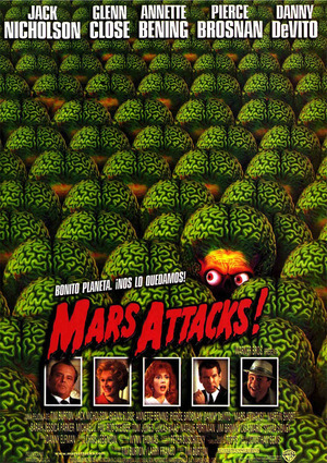 Bueno bueno! esta peli es super divertida y como no es de mi queridisimo Burton ....Bueno todo es estupendo en la pelicula. Empezando por los actores: un genial Nicholson como presidente del gobierno, Martin Short (con esa cara q no tienes mas remedio q reirte cuando lo miras..), Brosnan, SAra jessica Parker y Michael J.Fox (q son exterminados de la peli casi casi al comienzo...) jejej y los marcianos q parecen los de las pelis de los ’40 o 50’ y con ese peculiar modo de hablar, q me parti de risa con ellos. jejjee