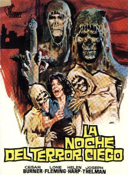 | Crítica |  Puntuación del crítico: 6 | En los años 70 España estaba en su época dorada del genero fantástico y de terror, hacia una media de 80 películas de genero y sus películas se exportaban por todo el mundo. Un caso es el de Amando de Osorio, que con esta “La Noche del Terror Ciego” tuvo un gran éxito comercial no solo en España si no también en América, gracias a este éxito pudo hacer una tetralogía empezando con esta y a la que siguen "El ataque de los muertos sin ojos", "El buque maldito" y "La noche de las gaviotas" películas que aun no he visto pero en cuanto pueda las veré (están todas para bajar en el e-mule para quien le interese) y La Noche del Terror Ciego esta editada en DVD en España. La película respira un aire a las películas clásicas de terror con una gran ambientación y unos efectos de maquillajes, que a pesar de no ser una maravilla son bastante resultones. El guión tiene bastantes baches, no esta demasiado cuidado en cuanto a la información de estas criaturas, a mí me dejaron las ganas de saber mas, de donde vienen (ya sé que lo explican pero muy confusamente) se nos dice algo de rituales satánicos y esas cosas, pero no entiendo si en la peli salen por la noche (como la mayoría de las criaturas) porque a veces se quedan hasta el dia para seguir a su victima, que conque menuda rapidez se pasan las noches, la tia se acaba de acostar, salen los bichos y en cuanto consigue salir al campo ya es de dia. Los personajes están bien estructurados, la mejor parte es la primera aparición de estas criaturas con la tia escondida en su habitación en ruinas, te quedas pensando, quien es la gilipollas que se tira de un tren en marcha y se queda a dormir en un castillo en ruinas en medio de la nada, y es que encima la tia enciende una hoguera con una cerilla y unas ramas secas, se pone el pijama, se mete en el saco de dormir, enciende una radio portátil y se pone a leer como si estuviese en su casa, pero tia, que estas en medio de no se donde en un castillo desconocido rodeada de Zombis... en fin, así la película tiene mas gracia XDDD Por cierto, la escena en la que los guerreros en caballos persiguen a la chica es idéntica a la parte en que Frodo es perseguido a caballo e “El señor de los anillos”, mismos trajes, mismos caballos, fotografía parecida... También tiene toques al cine de Dario Argento como ese pasillo lleno de maniquís con una luz roja parpadeante que pone los pelos de punta, una técnica muy utilizada por Argento para sus películas y que dan un toque de pesadilla al asunto. El final es muy bueno aunque te quedas un poco raro, como diciendo que pasara luego...