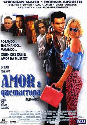 "Amor a Quemarropa" es una pelicula de culto (muy a mi pesar) por su extrema violencia y por contar con el guion de un ultravalorado Tarantino (eso no quita maravillas como "Reservoir Dogs" y alguna más...) que aquí no está nada fino. En su guión plasma sus fustraciones: el prota es un calco de él (no físicamente,claro) de cuando él era un joven solitario y trabajaba en un videoclub (lo de solitario se soluciono cuando se hizo famoso y, así, pudo cepillarse a Mira Sorvino...).