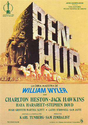 Una oscarizada (nada menos que 11, un hito sólo igualado ayer mismo por EL RETORNO DEL REY y en el 97 por la sobrevalorada TITANIC) y ambiciosa producción de William Wyler, un polifacético realizador que se atrevía con todo. Charlton Heston la verdad es que no hace la interpretación de su vida, pero está correcto en su papel, es más, no podría imaginar la película si él, es el alma de la peli. Para la historia la mítica carrera de cuádrigas. Un monumento al cine, con todas las de la ley.