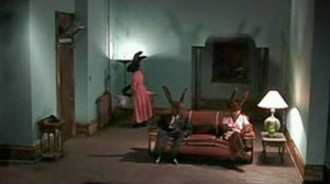 Una habitacion, una familia de conejos, dialogos absurdos, plano fijo y apariciones fantasmales... En una habitacion cada minuto mas extraña.