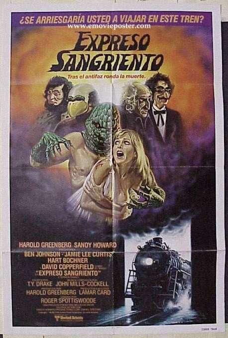 Por cierto, un buen cartel, donde se ven todos los trajes que utilizo el psicopata durante el viajecito en el tren. La mas terrorifica y mejor escena de la pelicula es la persecución final, donde Jamie Lee tendra que huir por los vagones traseros con el psicopata disfrazado esta vez de viejo arrugao, el mejor de todos los disfraces, acompañada de una sucia imagen que lo hace aún mas espeluznante..........