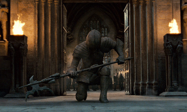 Los actores cumplen todos con creces, los jóvenes actores se defienden bastante bien en sus personajes, demostrando que al igual que sus personajes han ido madurando con ellos, con un Daniel Radcliffe orgulloso de la suerte que ha tenido al protagonizar semejante saga, una Emma Watson que a la par de ser una tía inteligente se ha convertido en un bellezón de lo más sofisticado, y un Rupert Grint menos payasete y más centrado, aunque sigue con sus gracias. Los secundarios son aún más grandiosos, Ralph Fiennes disfruta como un enano siendo el malo de la película, y nos muestra a un Voldemort grandioso, convirtiéndose en uno de los villanos más emblemáticos y carismáticos del panorama, y eso que en las películas se ha omitido gran parte de la interesante historia de este personaje, pero que aun así se deja notar bastante. Helena Bonham Carter ha sabido captar su personaje, creando a una Bellatrix Lestrange histriónica, con una maldad histérica, y con una rabia tan grande por derrotar a Potter que casi supera a la de Voldemort, vamos, que ha sabido captar demasiado bien la locura de esta mujer, tan bien que asusta. Y bueno, un gran elogio para el personaje de Severus Snape, uno de mis favoritos y que más sorpresas ha dado durante la saga, interpretado majestuosamente por Alan Rickman, que ha sabido transmitir realmente el alma de Snape, me quito el sombrero ante él. El director de Hogwarts, Dumbledore, ha sido otro de los personajes más carismáticos, interpretado por dos actores diferentes (ya sea dicho que fue reemplazado por el fallecimiento del primer actor, aunque los dos han estado a la altura), y que ha estado en su sitio tanto en momentos buenos como en los malos. La profesora McGonagall sale poco, pero se hace notar, la que al principio de la saga caía medio bien medio mal se ha convertido en toda una heroína, su enfrentamiento con Snape junto a su frase “siempre he querido hacer este hechizo” son sus momentazos. Hagrid, que tanta importancia tenía en las primeras películas y que h ido perdiendo importancia durante la saga, aquí apenas sale en una escena, aunque ha sido un placer volver a verle por última vez.